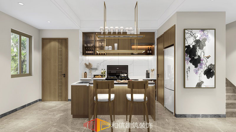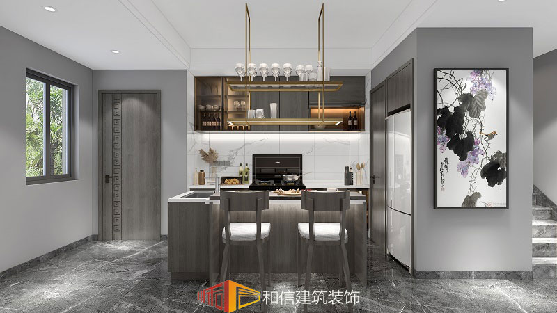 開放式的廚房加入金色設計元素,充滿熱情,讓整個廚房風格輕奢化、個性化、簡約化,更能承載豐富多彩的生活,小吧臺的吊燈方型線條,純粹的空間結構和在細節上考究,是設計師精髓領會,家具的每一處動線皆是收尾呼應,在空間的布局上,打破現有的空間印象,廚房不僅僅是傳統意義上的廚房,更是承載了多元化的生活功能,讓人在慵懶的午后也能在其中輕松愜意享受時光。