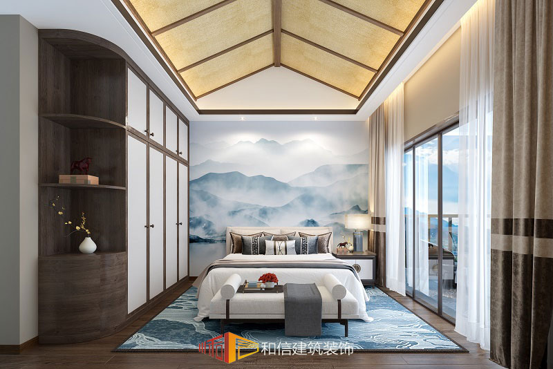 臥室以新中式的手法鋪陳,以自然美景作為點綴,通透而不失大氣,室內濃郁的中式氣息,搭配古典色彩的家具,讓古典與現代完美結合,內與外是共生,一室陽光、一室清雅,一種意境,一種生活寫照。